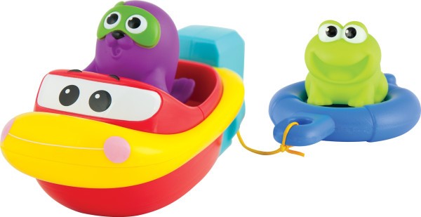 Foka jest doskonałym motorniczym. Żabkę umieść w kole ratunkowym i ciągnij za łódką. Oba zwierzątka po naciśnięciu tryskają wesoło wodą.