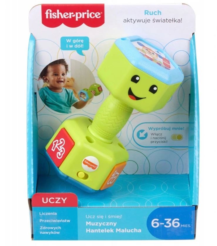 Czas na wesoły trening! Urocze światełka i melodyjki zachęcają do ćwiczeń. Ten hantelek ma też sporo piosenek i zabawnych wypowiedzi. Brzmi świetnie! Muzyczny Hantelek Malucha z linii Fisher-Price Ucz się i śmiej! sprawi, że mali sportowcy będą się aktywnie bawić, jednocześnie ucząc o liczbach, przeciwieństwach i zdrowych nawykach. Aktywowany ruchem hantelek grzechotka podświetla się, gdy dziecko go podnosi. Grzechoczące kuleczki, wesoła muzyka i kolorowe światełka zachęcają malucha do ruchu. Zawartość edukacyjna w języku polskim.