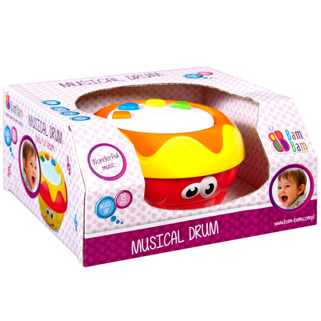 Muzyczna, edukacyjna zabawka dla dziecka od 18 m-ca. Zabawka w formie bębenka pozwala na odgrywanie ról przez dziecko i przeistoczenie się w małego muzyka. Kolorowe przyciski, wygrywające rożnorodne melodie, oraz migoczące, barwne światełka gwarantują doskonałą zabawę, jednocześnie stymulując zmysły wzroku, słuchu, percepcji oraz dotyku.