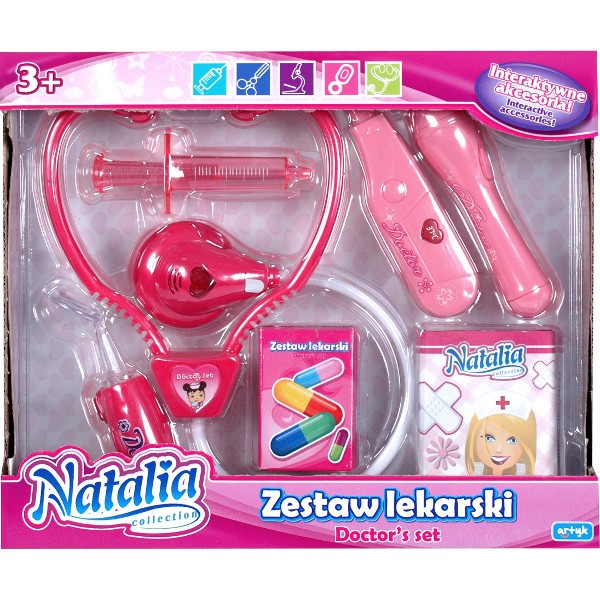 Oto zestaw, który zawiera wszytkie niezbędne akcesoria dla każdego małego lekarza! Skorzystaj ze stetoskopu, by posłuchać bicia serce lub z termometru, by sparwdzić temperaturę. Do dyspozycji masz różne przedmioty,które wyglądem i funkcjami przypominają prawdziwe, lekarskie przyrządy!