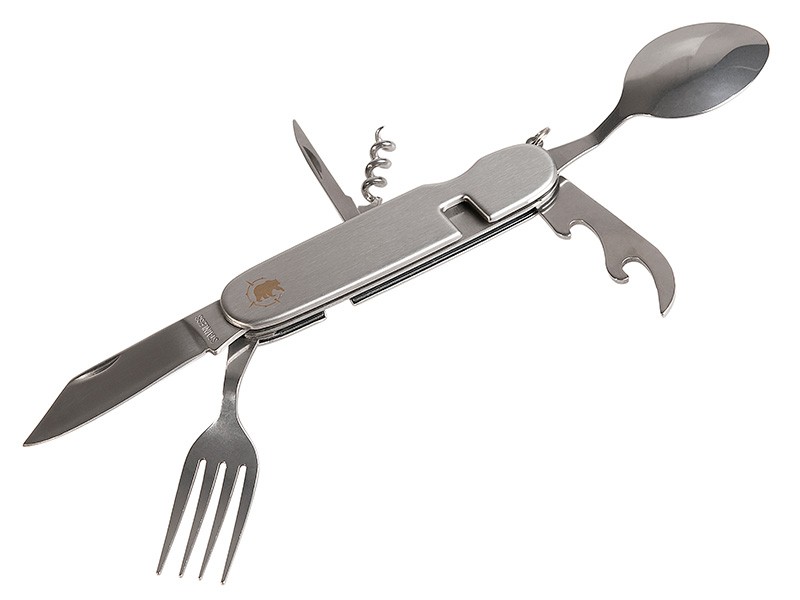 Praktyczny zestaw przyborów turystycznych zawierający sztućce - nóż, widelec, łyżkę, otwieracz do konserw, korkociąg oraz przebijak. Całość solidnie wykonana ze stali nierdzewnej!