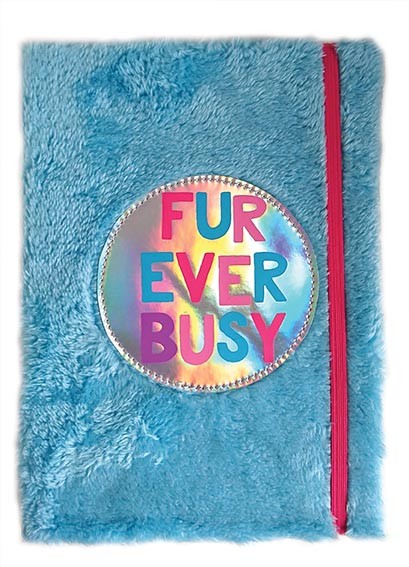 Notatnik ma króciutkie, błękitne futerko. Na środku okładki znajduje się mieniący metalicznie okrąg z napisem FUR EVER BUSY. Wygodna gumka zabezpiecza notatnik przed przypadkowym otwarciem.