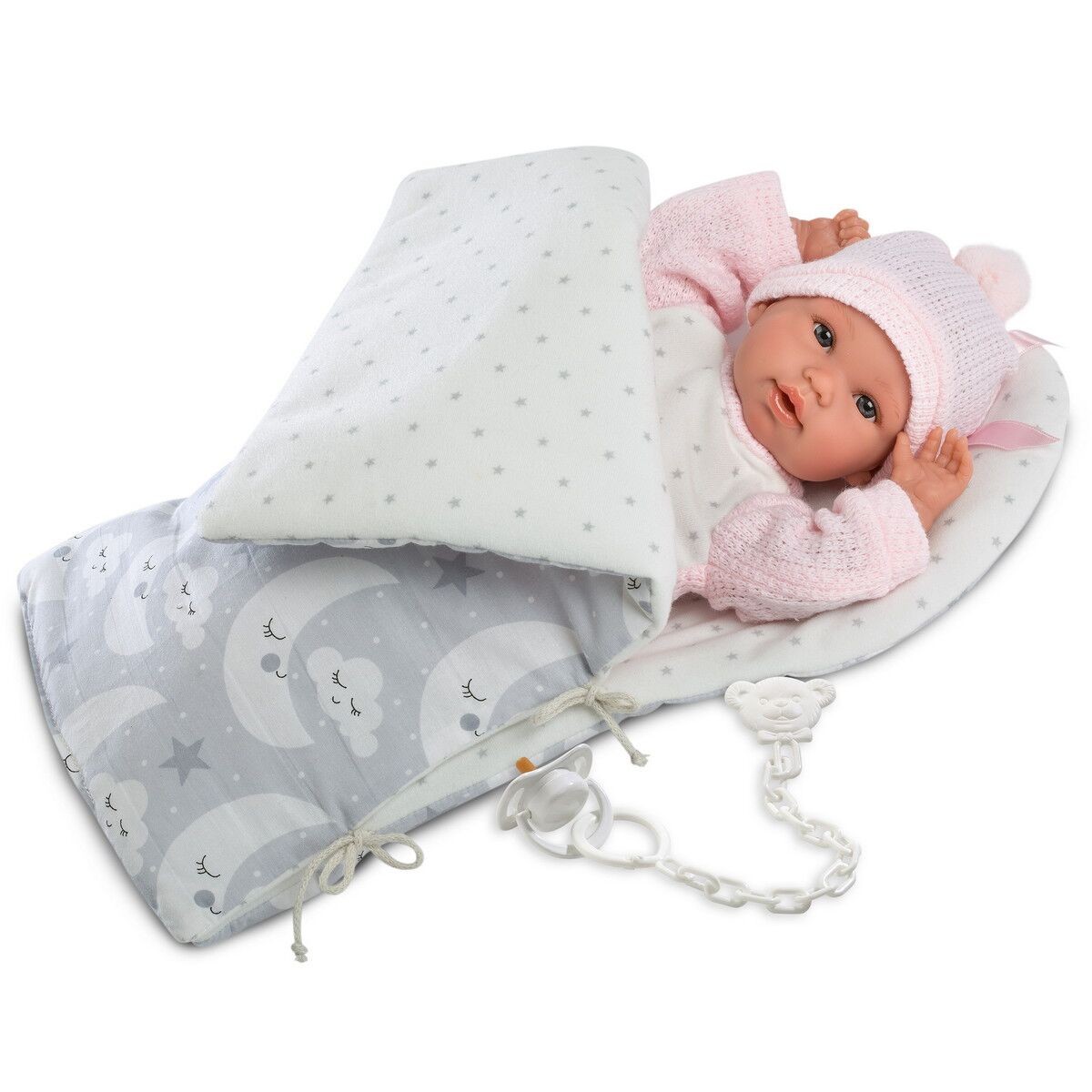 Noworodek Bebita w szarym śpiworze, 36 cm