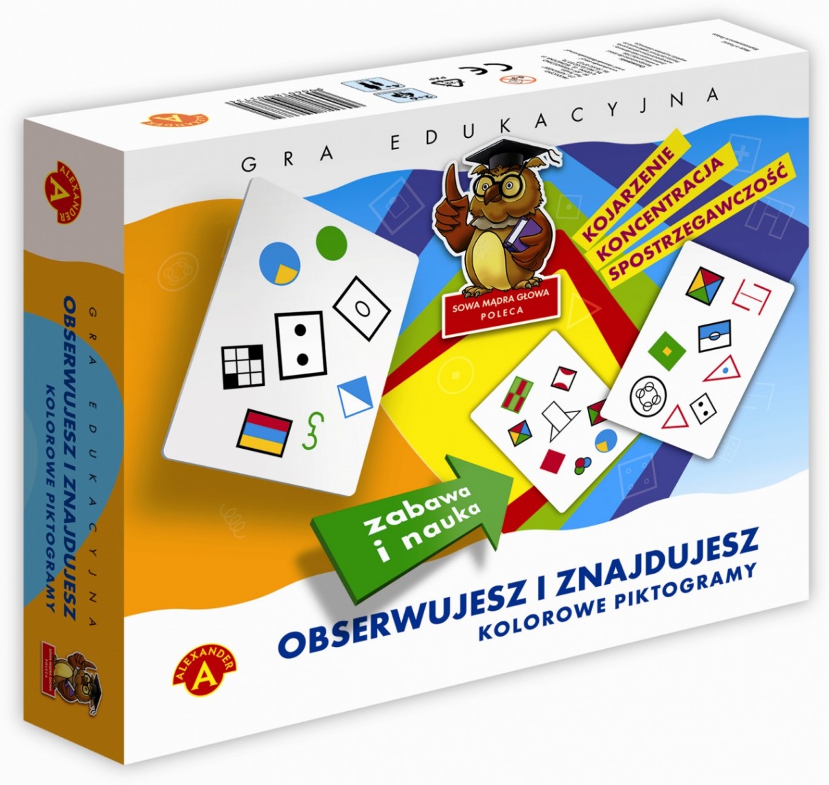 Proponujemy ciekawą grę zapewniającą dobrą zabawę, przy jednoczesnym kształtowaniu koncentracji, spostrzegawczości i uważności. Procesy te niezbędne są podczas pracy mózgu w każdym wieku. Na kartach znajduje się po 8 różnych kolorowych znaków i figur. Karty między sobą mają wspólny znak/figurę, którą należy znaleźć i wskazać palcem na karcie ze stosu kart. Celem gry jest odnalezienie wspólnego dla dwóch kart znaku. Przy każdorazowym "starciu" wygrywa ten gracz, który jako pierwszy wskaże wspólny dla dwóch kart znak. Gdy zdarzy się, jednoczesne wypowiedzenie słów, należy kartę przełożyć na koniec stosu kart.
