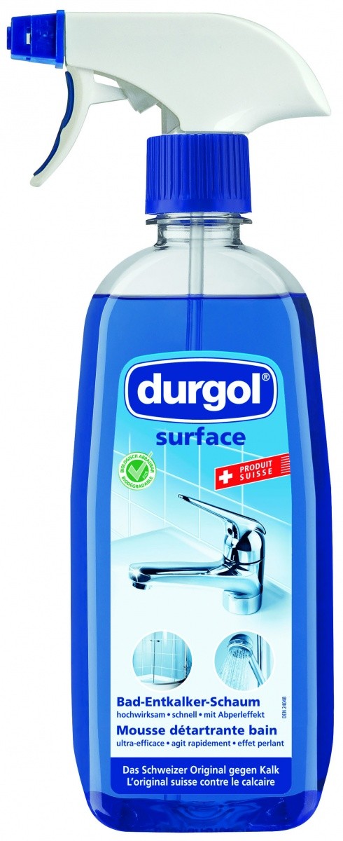 Durgol ® surface jest polecany do stosowania w łazience (na np. uchwyty, umywalki i zlewy, ściany prysznicowe, itp.). Łatwo usuwa uporczywe osady z urządzeń i powierzchni nadając im znakomity połysk. Durgol surface dobrze przylega nawet do pionowych do powierzchnia co ulatwia sprzątanie. Wystarczy spryskać, zostawić na kilka chwil, i dobrze spłukać zimną wodą. Nie wymaga szorowania.