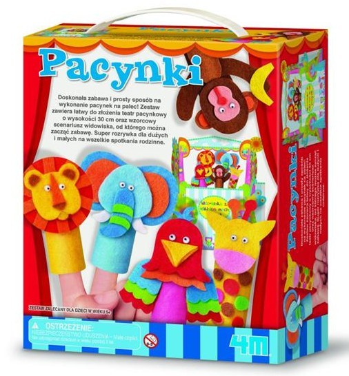 Doskonała zabawa i prosty sposób na wykonanie pacynek na palec! Zestaw zawiera łatwy do złożenia teatr pacynkowy o wysokości 30 cm oraz wzorcowy scenariusz widowiska, od którego można zacząć zabawę. Super rozrywka dla dużych i małych na wszelkie spotkania rodzinne. To super zabawa! Baw się i ucz jednocześnie!