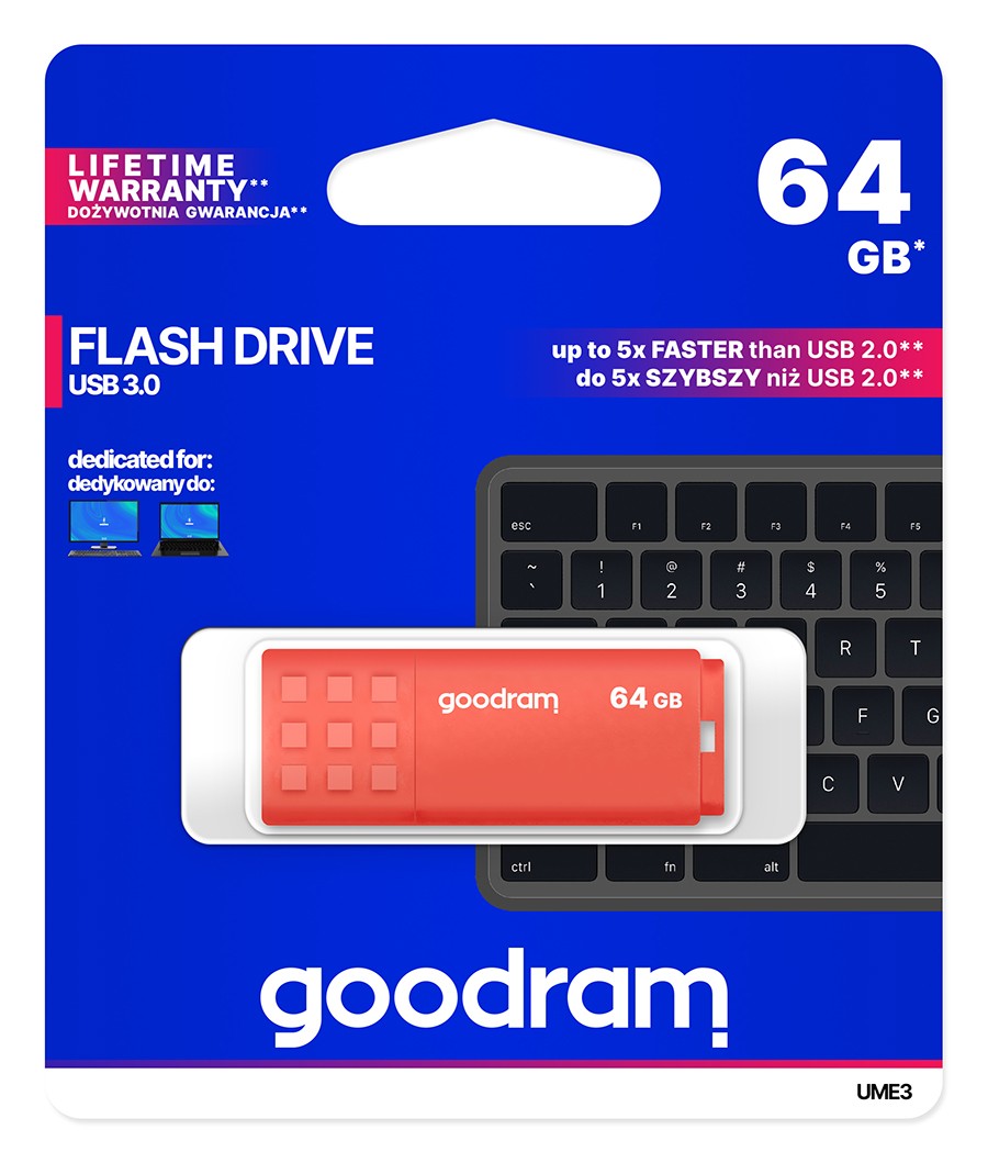 UME3 to klasyczny design, przełamany intensywnością kolorów obudowy. Zatyczka z wypukłym antypośligowym wzorem ułatwia otwarcie USB w każdej sytuacji. Po zdjęciu zatyczki można ją nałożyć na drugi koniec obudowy daje to pewność, że się nie zgubi. Idealnym rozwiązanie dla tych, którzy lubią mieć pamięci USB zawsze przy sobie, jest perforacja umożliwiająca przypięcie zawieszki. Pamięć UME3 dostępna jest w pojemnościach od 16 GB do 128 GB. Użyte komponenty pozwalają uzyskać prędkości odczytu do 60 MB/s i zapisu do 20 MB/s. Podobnie jak wszystkie inne pamięci USB marki GOODRAM, UME3 objęty jest dożywotnią gwarancją producenta.
