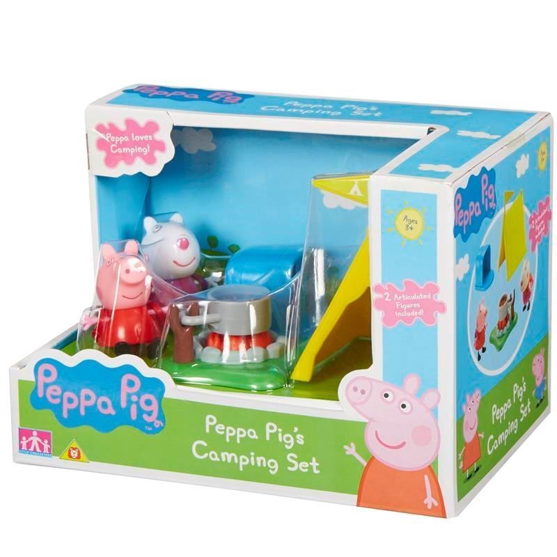 Zestaw zawiera 2 figurki ze zdejmowanymi plecakami (świnkę Peppę, owieczkę Suzy), namiot oraz ognisko z akcesoriami.