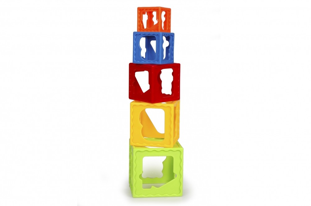 Każdy z nich różni się kolorem i rozmiarem i posiada twory w kształcie cyferki, literki, misia, pięcioboku, domku. Sześciany są bardzo lekkie i łatwe do uchwycenia dla maluszka. Można je układać w formie wieży albo chować jeden w drugim. Dedykowane dzieciom od 12 miesiąca życia.