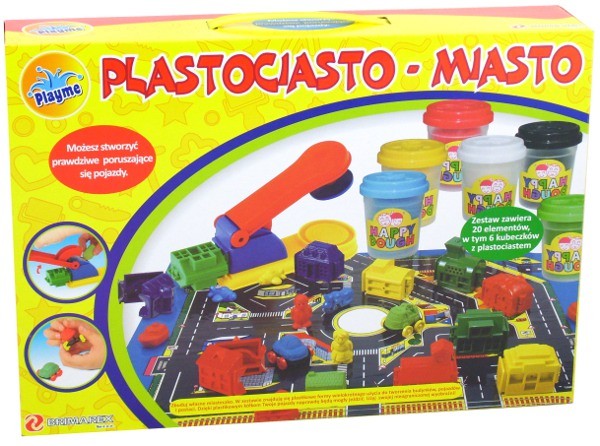 Zawiera 5 pojemników plastociasta oraz 14 akcesoriów: foremki domu, samochodu, samolotu, motocykla, pociągu, zestawy kół, foremki, postaci, szpatułkę.