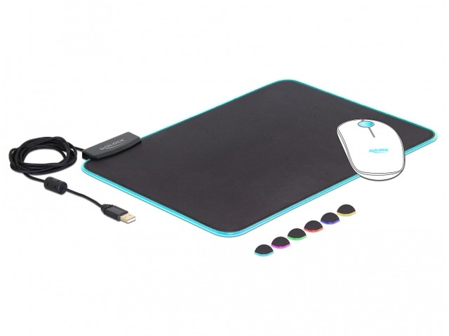 Wysokiej jakości podkładka myszy Delock może być podłączona do komputera kablem USB Typ-A Przekonuje krawędzią podświetloną RGB. Przycisk na boku pozwala na wybór 7 różnych odcieni, które można włączać np. konkretną barwę albo gładkie widmo barw. Specjalnie dobrany rozmiar daje wystarczająco miejsca do pracy pomocą myszy.