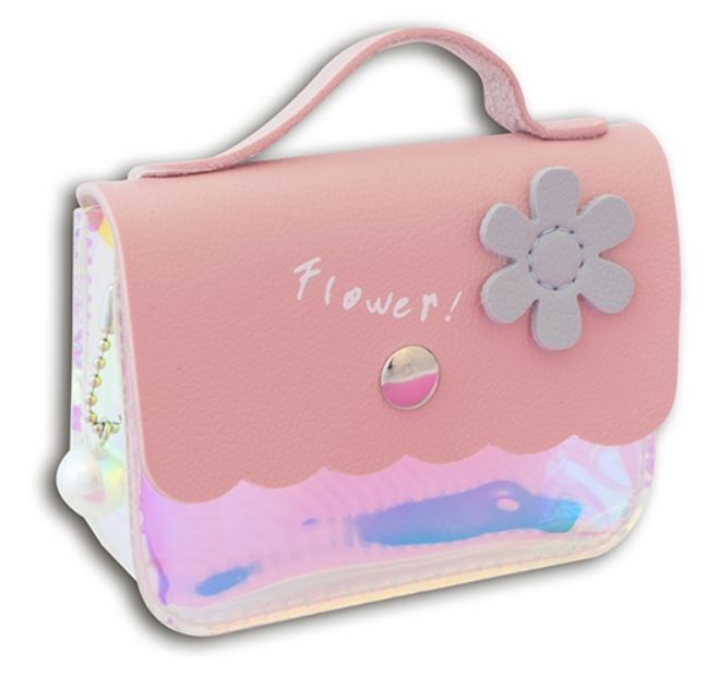 - Portfeliki ozdobione są kwiatkiem i wiszącą perełką.