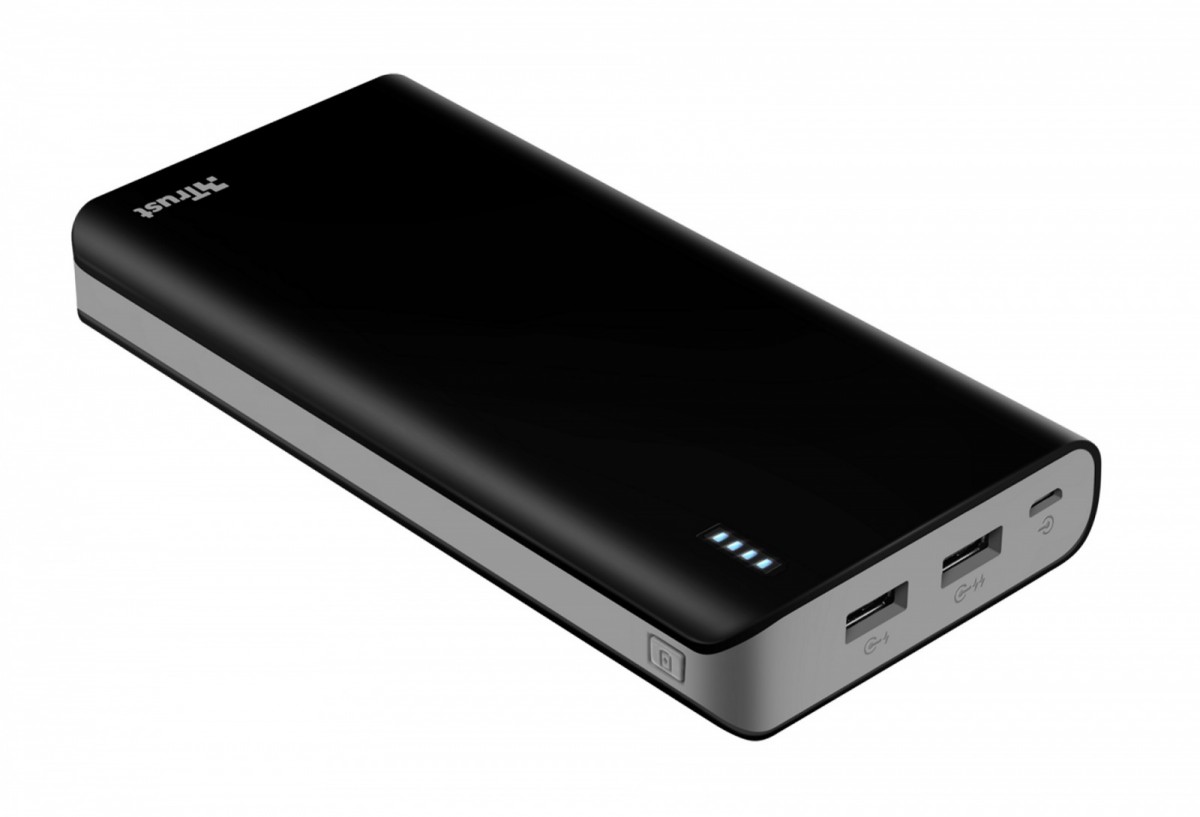 Przenośna ładowarka z 2 portami USB oraz wbudowanym akumulatorem o pojemności 20.000 mAh, umożliwiająca ładowanie telefonu lub tabletu w dowolnym miejscu