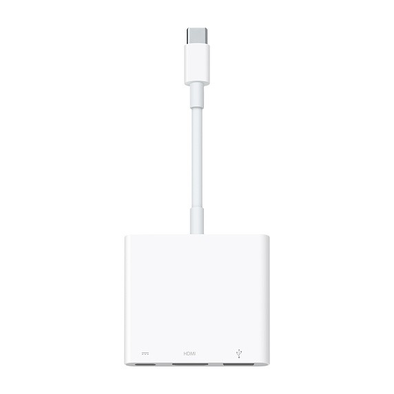 Wieloportowa przejściówka z USB-C na cyfrowe AV pozwala podłączyć Maca lub iPada Pro z portem USB-C do monitora HDMI przy jednoczesnym podłączeniu standardowego urządzenia USB i przewodu zasilającego USB-C.