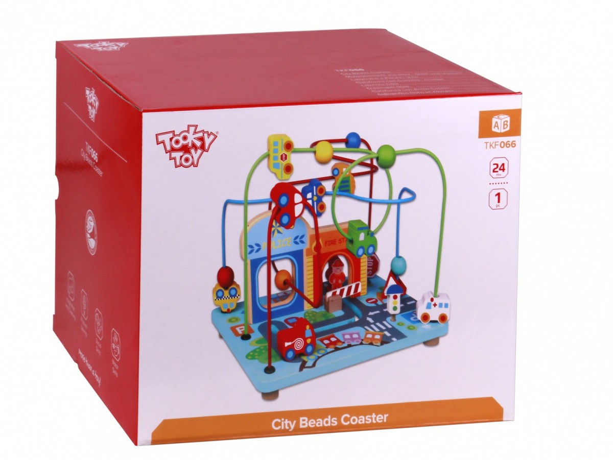 Zakręcone Miasto to drewniana zabawka z labiryntami po których przesuwamy barwne koraliki i figurki pojazdów.