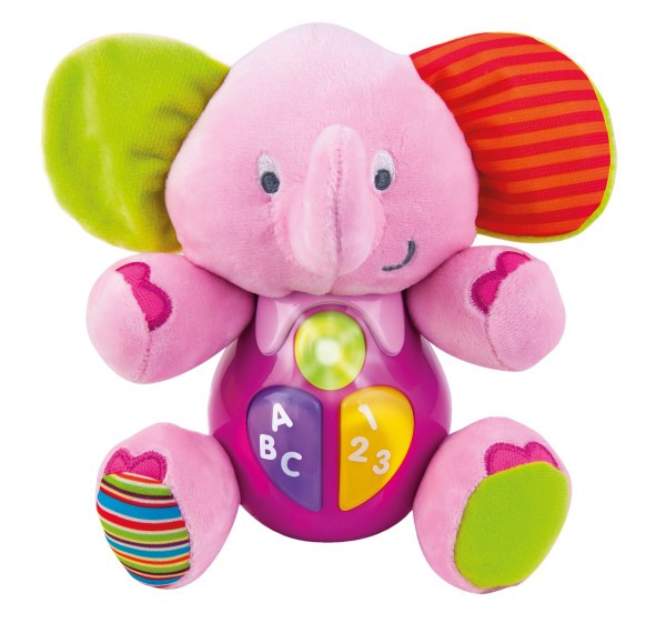 Na brzuszku zwierzątka znajdują się trzy kolorowe przyciski funkcyjne, które uruchamiają różne melodie oraz uczą dzieci podstawowych cyfr i liter. Dodatkowo posiada mięciutką główkę i stópki.