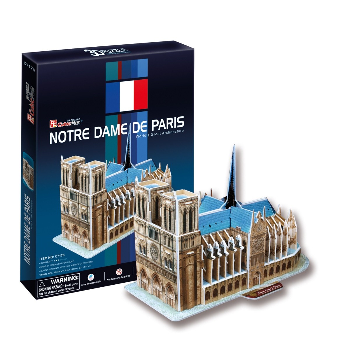 Opakowanie zawiera puzzle 3D, które umożliwiają złożenie modelu Katedra Notre Dame.