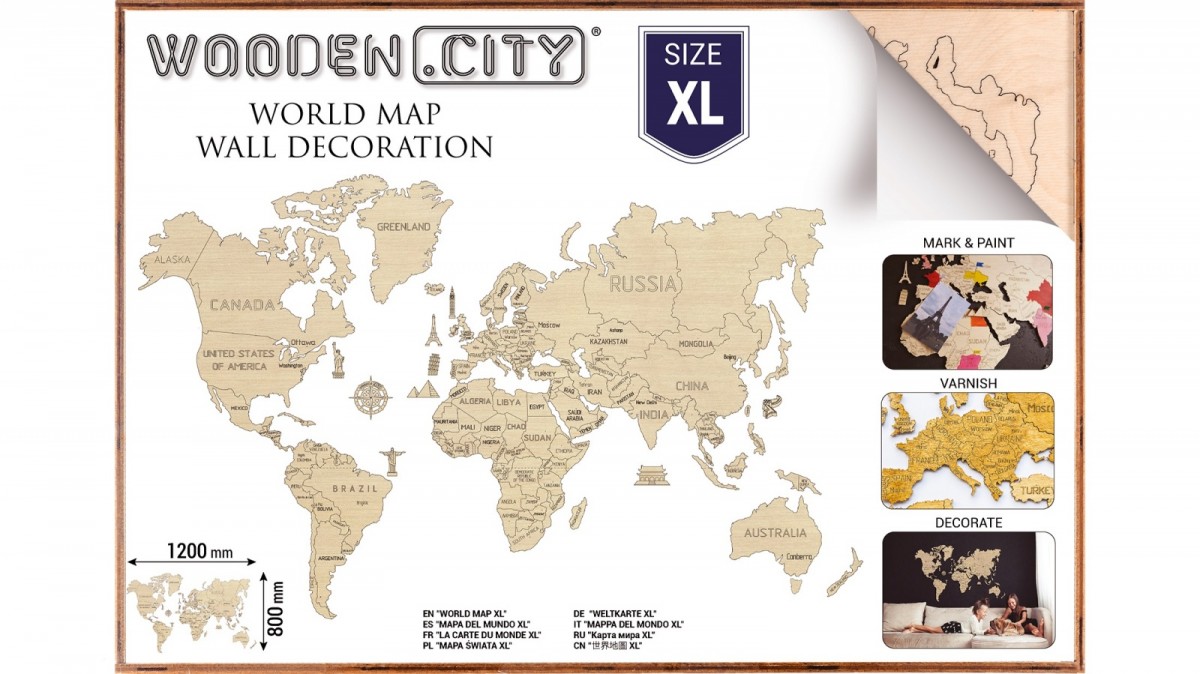 "Nigdy nie oszczędzaj na tym, czego nie możesz zrobić ponownie", powiedział słynny amerykański pisarz i podróżnik, Tony Wheeler. Czy odwiedziłeś wiele krajów w Europie i Azji? Czy mieszkasz w Ameryce lub niedawno przyleciałeś do tego kraju? W takim razie podróż masz we krwi! Być może właśnie odbywasz swoją pierwszą międzynarodową podróż. Twoja ścienna mapa będzie Twoim przewodnikiem po świecie wspomnień, doświadczeń i przygód. Czy posiadasz wiele wspomnień z różnych miast i krajów? Teraz możesz je sobie przypomnieć, siedząc przy stole z przyjaciółmi, dzieląc się wrażeniami i pokazując im na mapie miejsca, które odwiedziłeś. Jeśli podróżujesz z całą rodziną, dzieci z pewnością będą chciały namalować na mapie, gdzie były za pomocą farb akrylowych! Czy możesz oznaczyć odwiedzone kraje za pomocą flag? Tak, z łatwością! Drewno jest wystarczająco miękkie, aby wbić miniaturowe maszty flagowe. Podróżuj częściej, ale nie zapominaj, że Twoja mapa świata czeka na ciebie w domu, abyś mógł postawić następną "flagę".