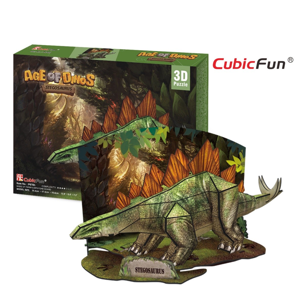 Opakowanie zawiera puzzle 3D, które umożliwiają złożenie modelu Stegosaurus.