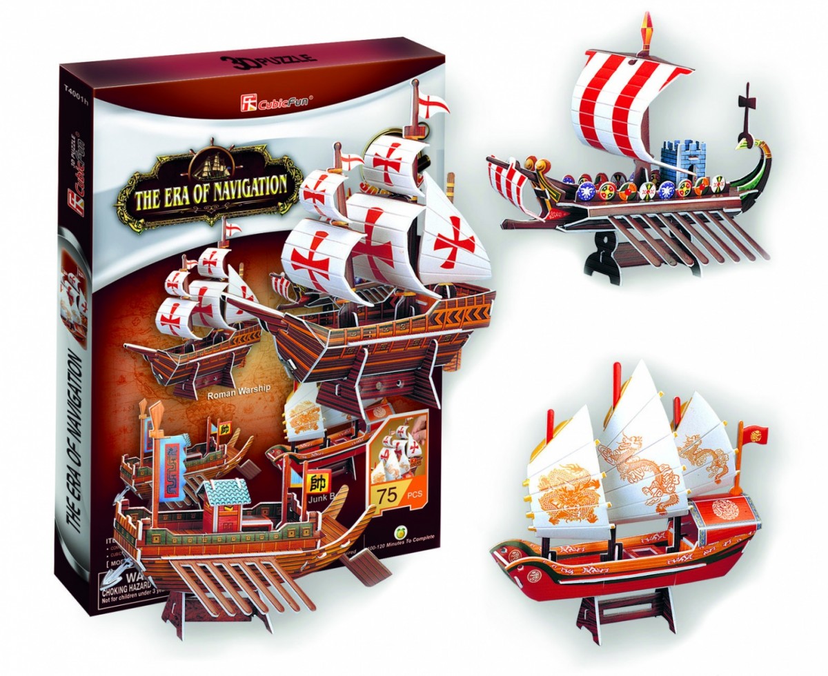 Wspaniały zestaw producenta Cubic Fun zawierający aż 4 statki w jednym opakowaniu! Puzzle 3D to pasjonująca zabawa dla dzieci oraz kolekcjonerów najsłynniejszych budowli i statków świata. Zalecany wiek dziecka to 6+ ze względu na wysoki stopień skomplikowania statków. Dzięki temu zestawowi można samodzielnie złożyć rzymski statek wojenny, popularną Santa Maria, Panoksun oraz Dżonkę. Całość składa się z 75 elementów, które są ponumerowane i ponacinane, a składanie ich nie wymaga użycia nożyczek ani kleju.