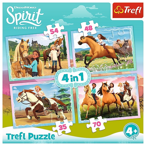 Puzzle składające się z 4 niezależnych układanek, zaprojektowane z myślą o wszystkich fanach i fankach bajki "Spirit Riding Free". Po ułożeniu układanek powstaną obrazki o wymiarach 285 x 205mm. Zróżnicowana liczba elementów pozwala na zabawę zarówno młodszym, jak i nieco starszym dzieciom. Produkt został wykonany z wysokiej jakości materiałów, z zastosowaniem specjalnego kalandrowanego papieru odbijającego światło, co ułatwia układanie. Produkt został wyprodukowany w Polsce, a do produkcji zostały użyte materiały ekologiczne.