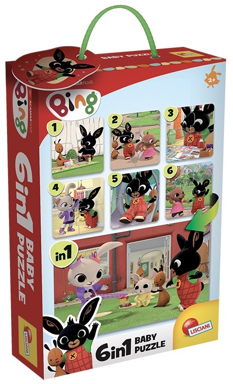 Zestaw 6 puzzli w 1 opakowaniu, które kształtem przypomina walizeczkę. Wszystkie zestawy umożliwiają ułożenie scenerii i scenek z bohaterami kreskówki Bing. Puzzle dostosowane są dla dzieci od drugiego roku życia i zawierają duże elementy wykonane z trwałej tektury