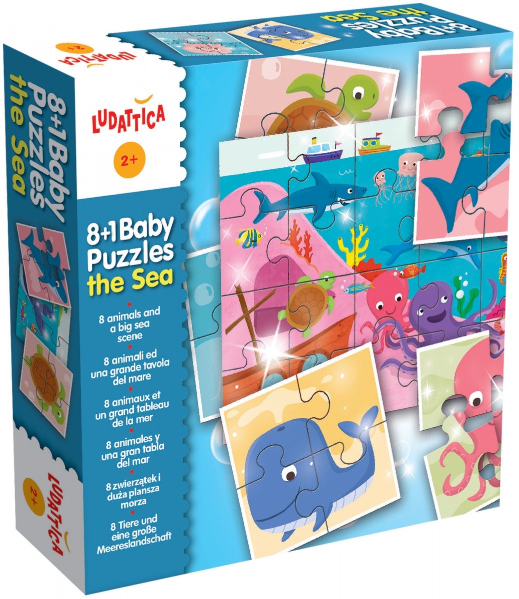 Zabawka składa się z 8 oddzielnych mini-puzzli przedstawiających morskie zwierzęta. Po ich odwróceniu i połączeniu otrzymamy duże puzzle z obrazkiem morskich głębin. Puzzle są wykonane z dużych, grubych elementów, dzięki czemu nadają się nawet dla najmłodszych dzieci.