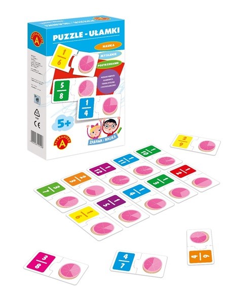 Wspaniałe wprowadzenie do nauki ułamków, pozwalające na proste zrozumienie mechanizmu ich tworzenia. Zabawa polega na dopasowaniu do siebie puzzli prezentujących zapis liczbowy z graficzną prezentacją danego ułamka.