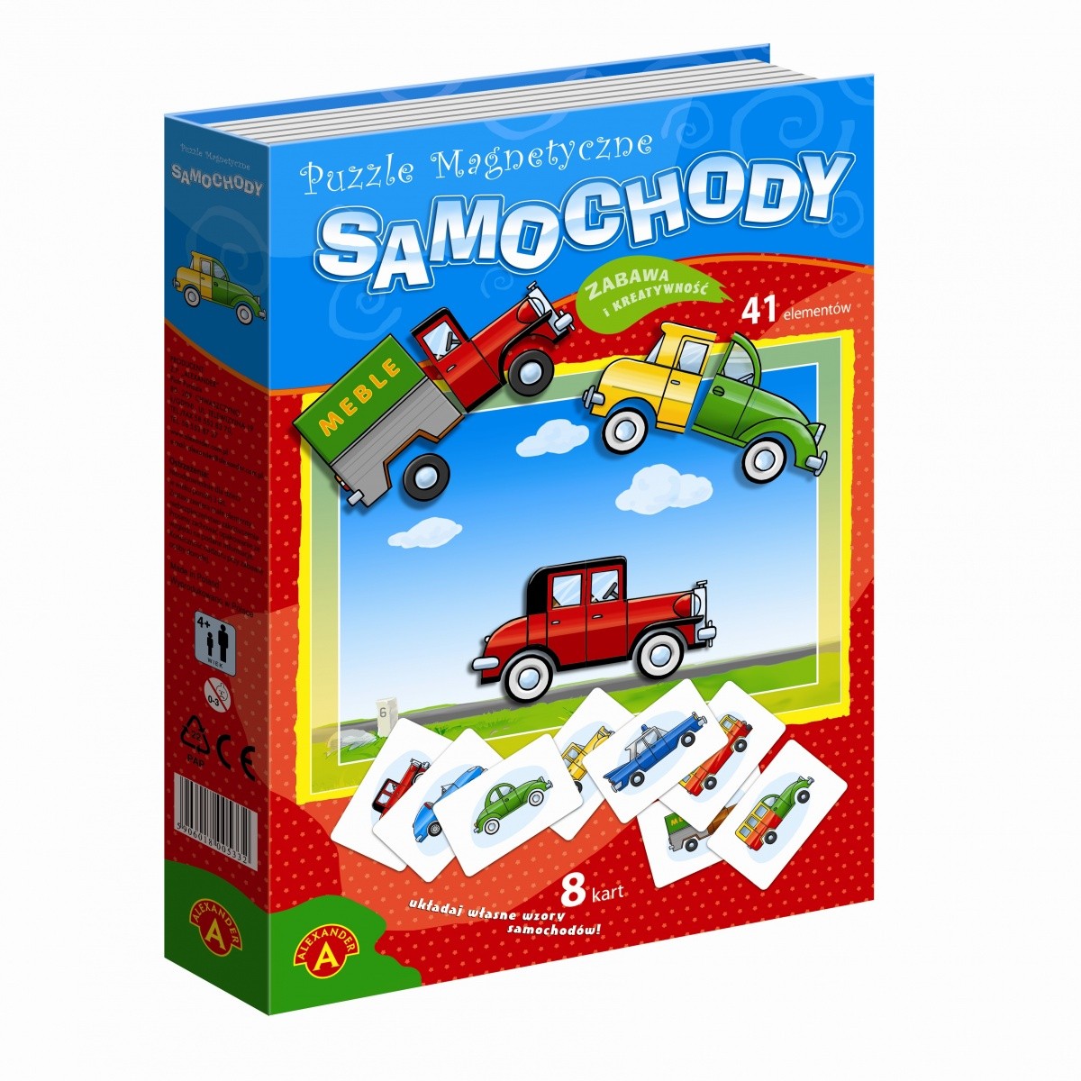 Puzzle magnetyczne - samochody - to zabawka, która składa się z kolorowej planszy, 8 kart wzorów i 41 elementów z warstwą magnetyczną na odwrocie.