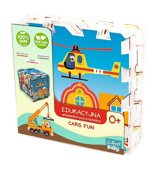 Puzzlopianka Środki Transportu łączy się z puzzlopianką Miasto, tworząc spójną graficznie, kolorową matę do zabawy o wymiarze 118 x 118 cm.