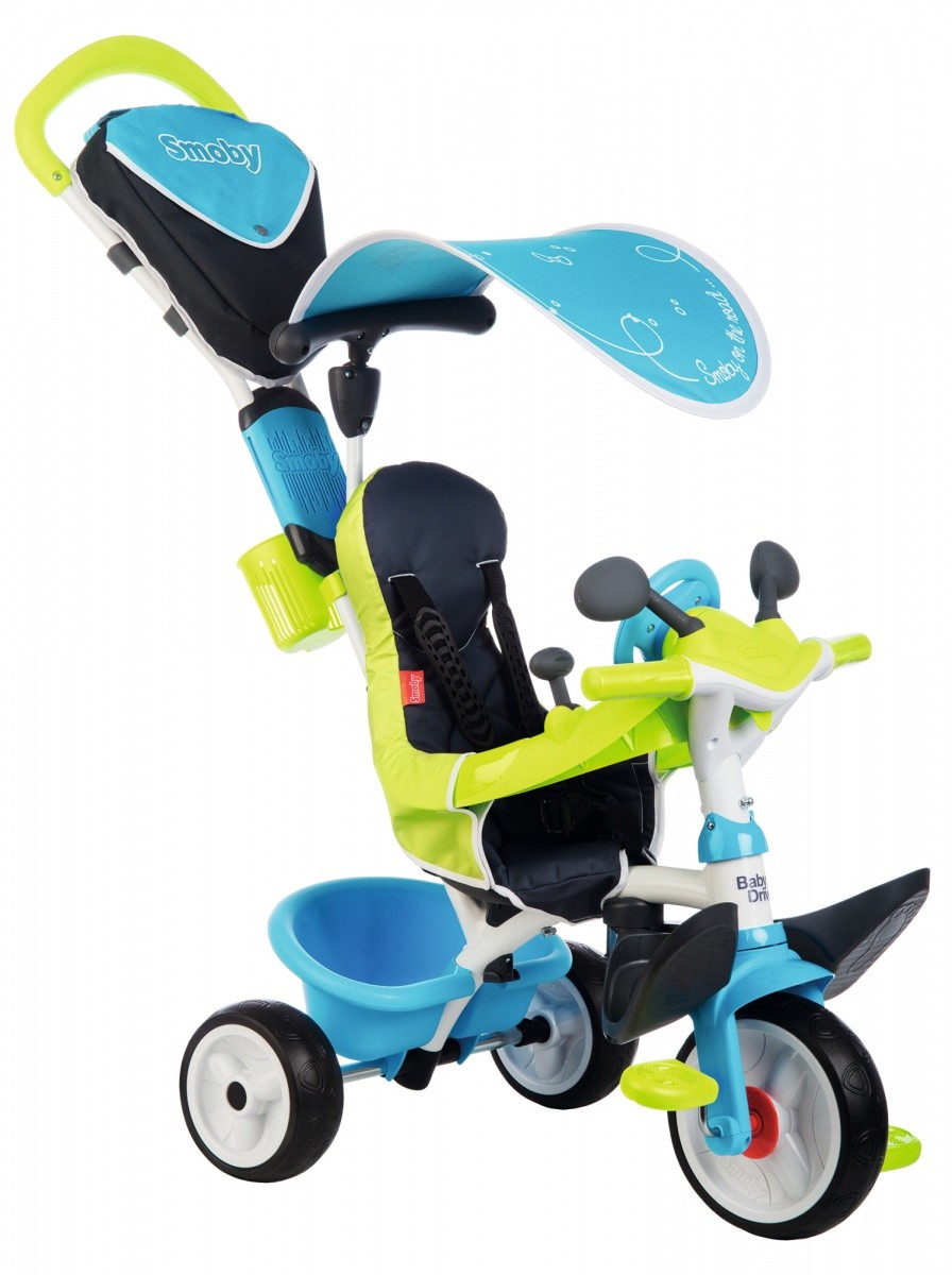 Z regulowaną rączką, blokadą kierownicy, pasami i pierścieniem bezpieczeństwa, komfortowym i ergonomicznym siedziskiem z zagłówkiem, blokadą wolnego koła, pojemnikiem na drobiazgi i torbą oraz daszkiem przeciwsłonecznym.