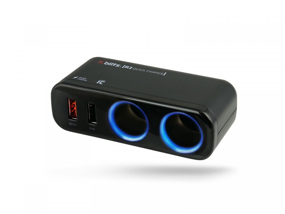 XBLITZ R2 QUICK CHARGE wyposażony jest w dwa gniazda usb, z których jedno obsługuje standard ładowania QC 3.0, a drugie posiada funkcję smart ic. Ponadto urządzenie posiada dwa gniazda zapalniczki.