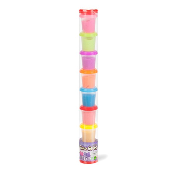 Zestaw zawiera 8 kubeczków z piaskiem kinetycznym, każdy w innym kolorze (niebieski, żółty, fioletowy, czerwony, pomarańczowy, ciemno niebieski, purpurowy, zielony).