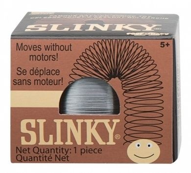 Slinky® Retro w Czarnym Pudełku to spężyna wykonana z metalu, w czarno-brązowym pudełku dokładnie tak, jak 1945 roku. Slinky® to jedyna oryginalna sprężyna produkowana w USA od 70 lat. Jest to niewątpliwie jedna z najbardziej popularnych i kultowych zabawek. Slinky „chodzi“ po schodach wydając chatekterystyczny dźwięk i przybliża dzieciom prawa fizyki.