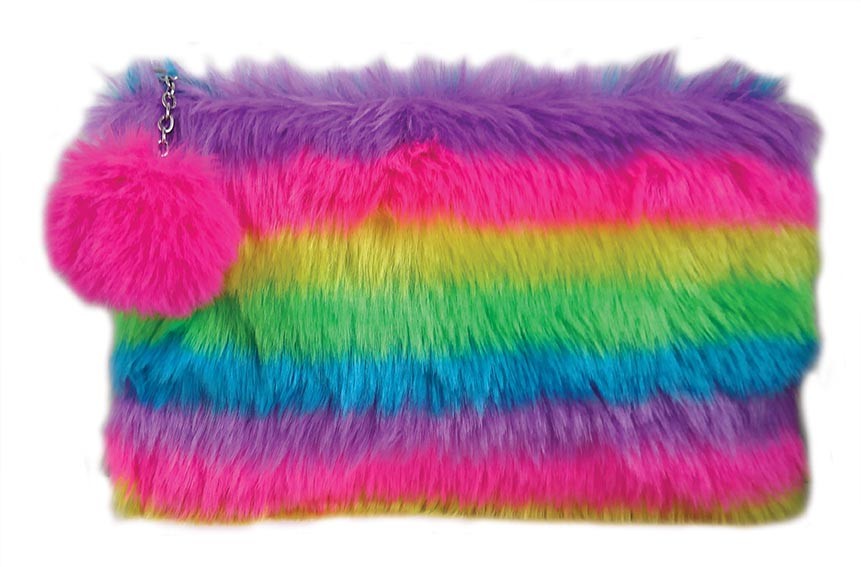 Kosmetyczka ma średniej długości tęczowe futerko. Futerko ma paski kolorów: żółtego, zielonego, niebieskiego, fioletowego i różowego. Kosmetyczka posiada jedną komorę zamykaną na zamek błyskawiczny, na końcu którego dynda różowy, futerkowy pompon.