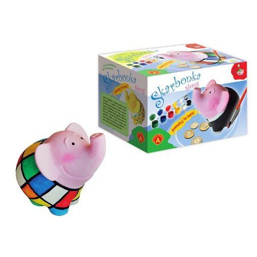 Zestaw zawiera 6 kolorów niezmywalnych farbek i pędzelek. Dzięki temu, każdy może pomalować swoją skarbonkę według własnej wizji i fantazji. W opakowaniu znajduje się również instrukcja, która zawiera kilkanaście przykładów na pomalowanie - co może być dobrą inspiracją dla każdego twórcy.