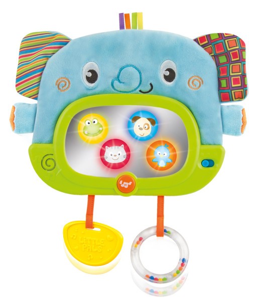 Słonik ma automatyczny wyłącznik (30 sek. w dzień i 3 minuty w nocy). Jest zabawką pełną niespodzianek. Na bezpiecznym lusterku pojawiają się ukryte postaci zwierzątek i delikatnie świecą. Szeleszczące uszy stymulują zmysł słuchu i dotyku. Gryzak ukoi bolące dziąsła. Grzechoczące kuleczki zaciekawią kolorami i dźwiękiem. Faktury materiałów pokazują, że coś może być miękkie lub twarde, gładkie lub chropowate.