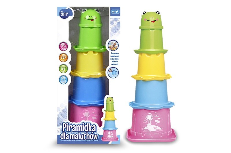 - Zestaw zawiera 4 kolorowe kubeczki i głowę żabki.