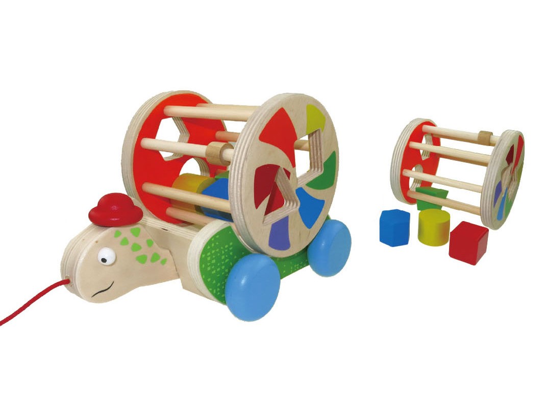 - Podczas ciągnięcia skorupa z sorterem kręci się, obracając wszystkie klocki. Zabawka zachęca do doskonalenia umiejętności chodzenia.