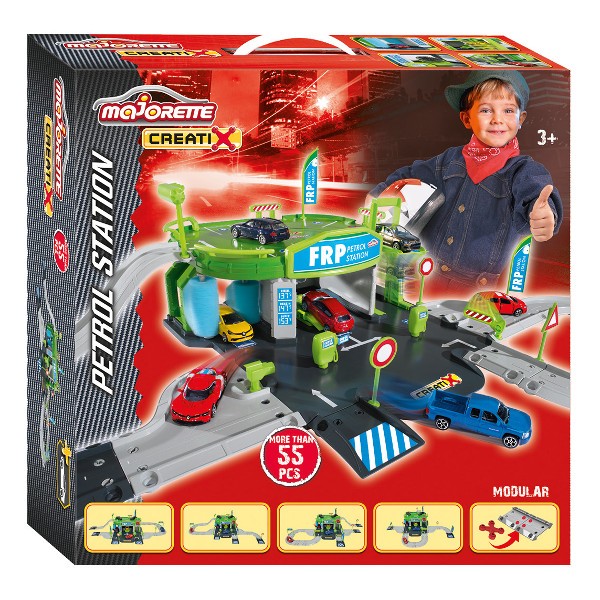 Creatix Stacja benzynowa z parkingiem i jednym dodatkowym samochodem. Zestaw zawiera 2-piętrowy garaż i składa się z 55 elementów. Stacja posiada windę oraz elementy tworzące drogę, które można układać na kilka sposobów. Produkt przeznaczony dla dzieci powyżej 3 lat.