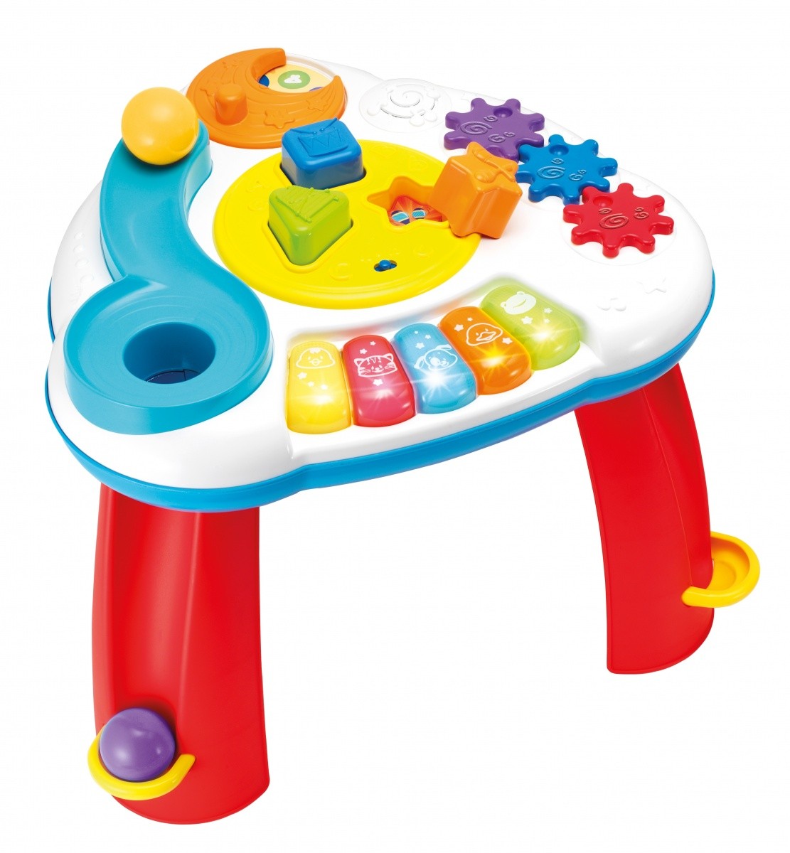 Stoliczek aktywizujący który kryje w sobie mnóstwo niespodzianek dla maluszka: sorter, pianinko, zębate kółka, zjeżdżalnie dla piłeczek, śpiewające zwierzątka