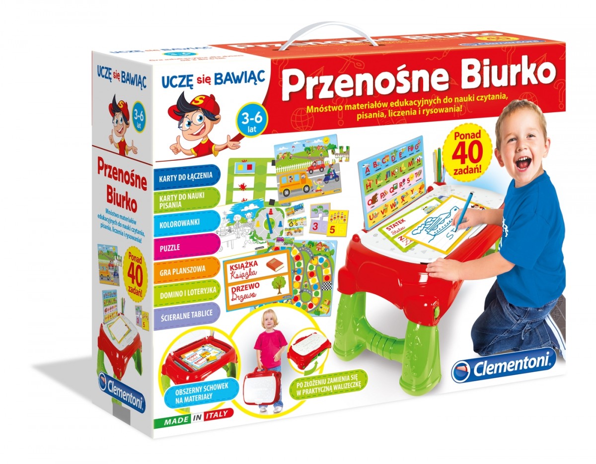 Stół może być zamykany i transportowany. Jest wyposażony w podręcznyschowek, kompatybilny ze wszystkimi produktami z serii Uczę się bawiąc!
