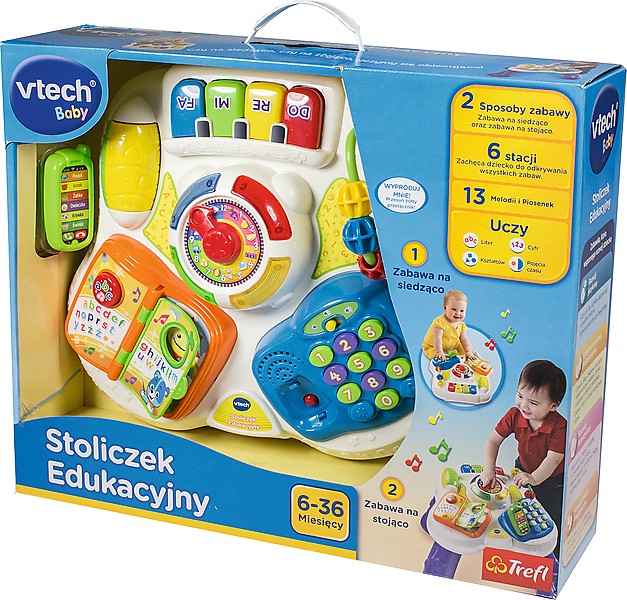 - Stoliczek Edukacyjny oferuje aż 6 stacji do zabawy