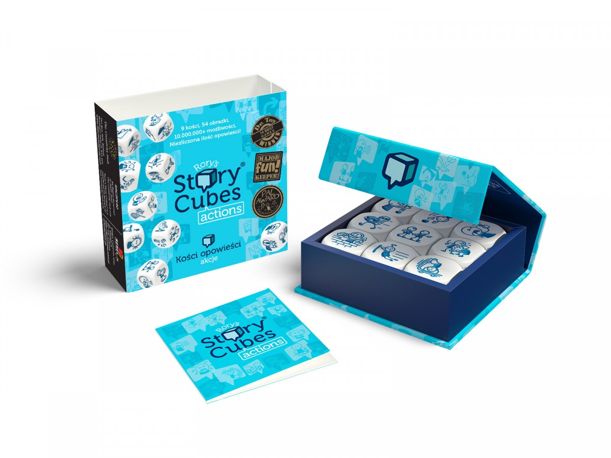 Story Cubes: Akcje są pierwszym rozszerzeniem kostek opowieści. Tym razem posiadają 54 unikalne ikonki opisujące większość najważniejszych słów związanych z wykonywaniem czynności, które mogą zostać wykorzystane przy snuciu opowieści.