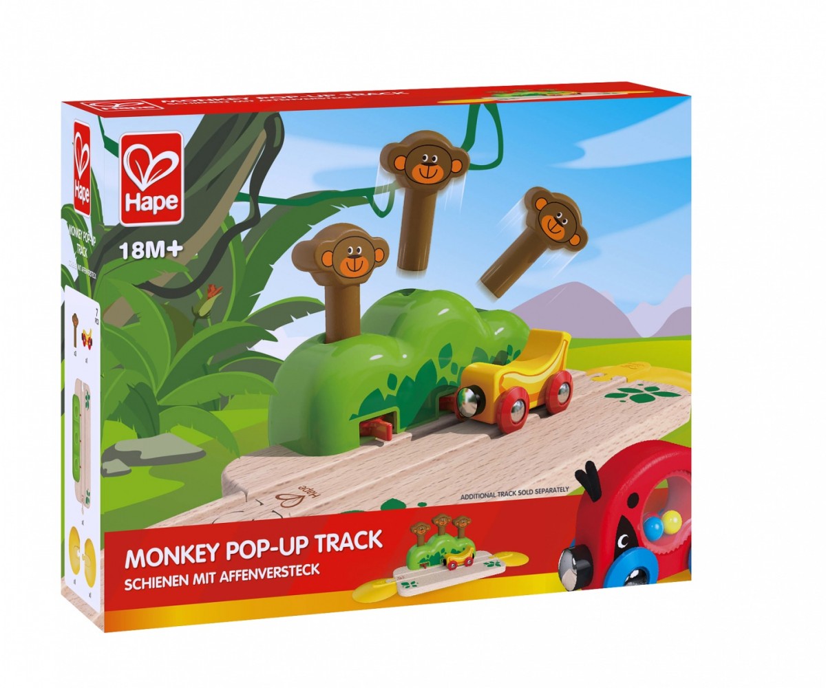 Tor z wyskakującymi małpkami to zabawny i niezwykle ciekawy dodatkowy element do istniejącego zestawu - gdy przejedzie po nim wagonik w kształcie banana, z krzaków wyskoczą wesołe małpki.