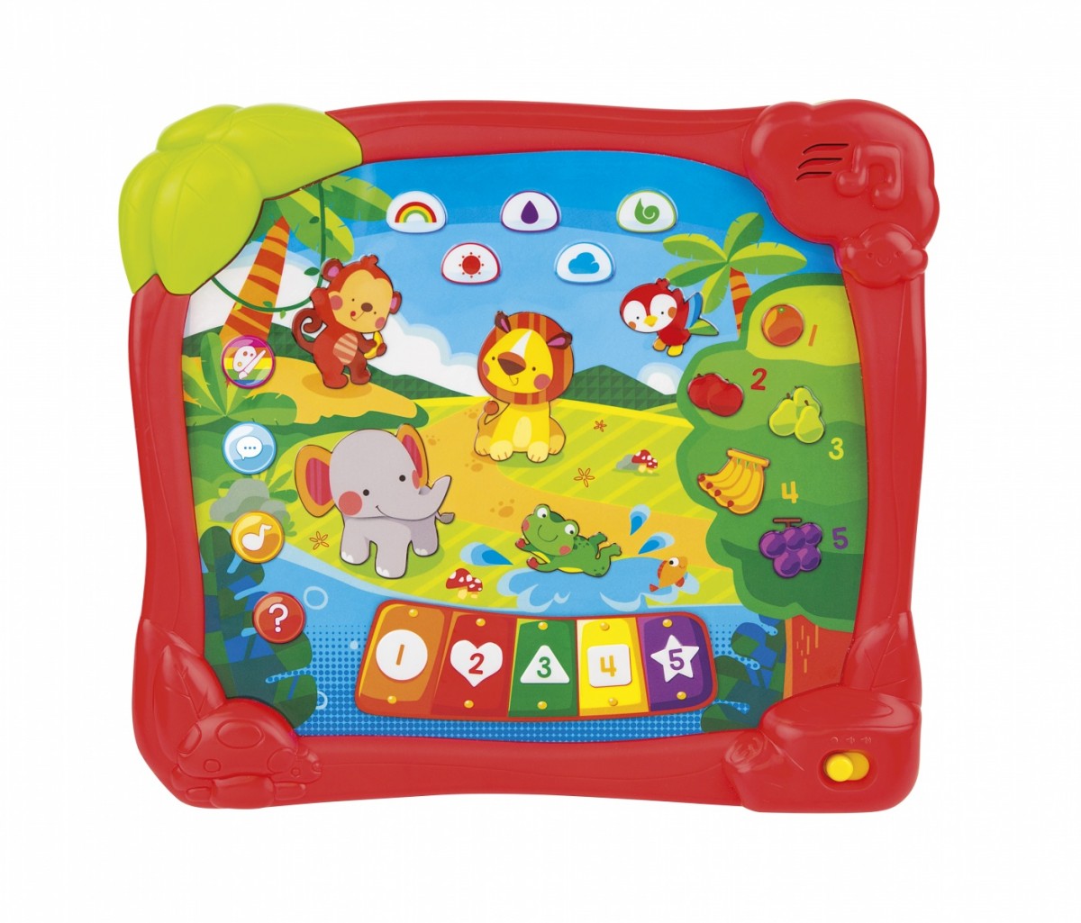 Ekran tabletu ma wiele funkcyjnych punktów. Dziecko naciska je i słucha melodyjek oraz odgłosów. Dobrze się bawi i jednocześnie rozwija percepcję słuchową.