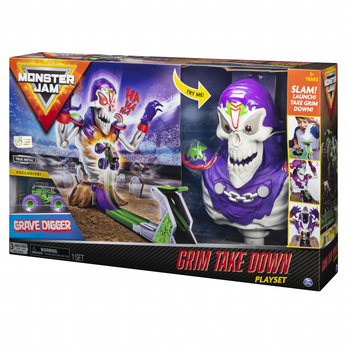 Przedstawiamy zestaw Monster Jam Grim Takedown ze światłami i dźwiękami! Ten zestaw to najlepsza z walk między Grimem a Grave Diggerem! Umieść auto Grave Digger 1:64 w wyrzutni, a następnie skieruj je w dół toru na bezpośrednią walkę! Aby pokonać tego groźnego potwora, musisz uderzyć go więcej niż raz! Ten niesamowity zestaw zapewnia pełną akcji zabawę!
