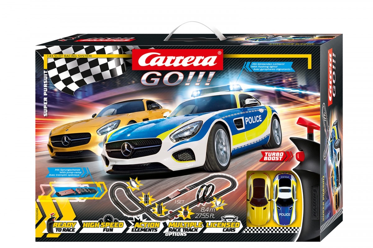 Wyszukany Mercedes-AMG GT Coupé dwukrotnie wyróżnia się na tym torze. Jeden pojawia się w barwach niemieckiej policji w stylowym niebiesko-srebrnym kolorze z migającymi światłami, drugi jako eleganckie Coupé Solarbeam w jasno złotych barwach. Spektakularna długosć toru 8,4 metra jest idealnym miejscem do szybkich pościgów między kierowcami w każdym wieku. Specjalną atrakcją jest wbudowana rampa do skoku, która zapewnia pościgom dodatkowy zastrzyk adrenaliny. Do tego dochodzą podwójne pętle i długie proste ,gaz do dechy! Czy policja złapie podejrzanych, czy może złoty samochód sportowy zniknie z pola widzenia?