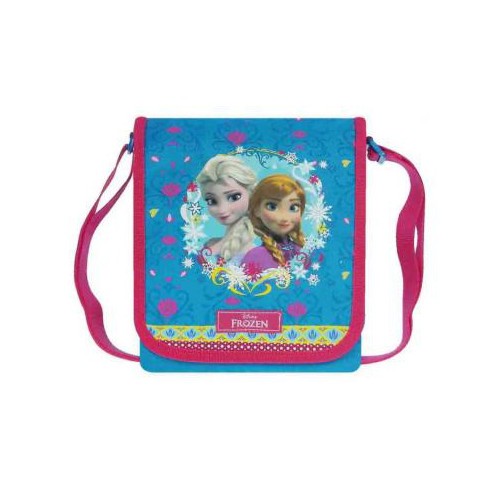 Torebka listonoszka Kraina Lodu Frozen renomowanej, holenderskiej firmy Vadobag. Wspaniałe kolory, wysoka jakość produktu. Główna kieszeń zamykana na rzep oraz dodatkowo na metalową napę. Wewnątrz kieszeni głównej kieszeń o wymiarach ok. 17x14cm (szer.x wys.) zamykana na zamek oraz kieszonka na ok. 8x10cm (np. na komórkę). Regulowana długość paska. Całość przepięknie wykonana i w ślicznych kolorach. Idealna dla młodej wielbicielki bohaterek Krainy Lodu.