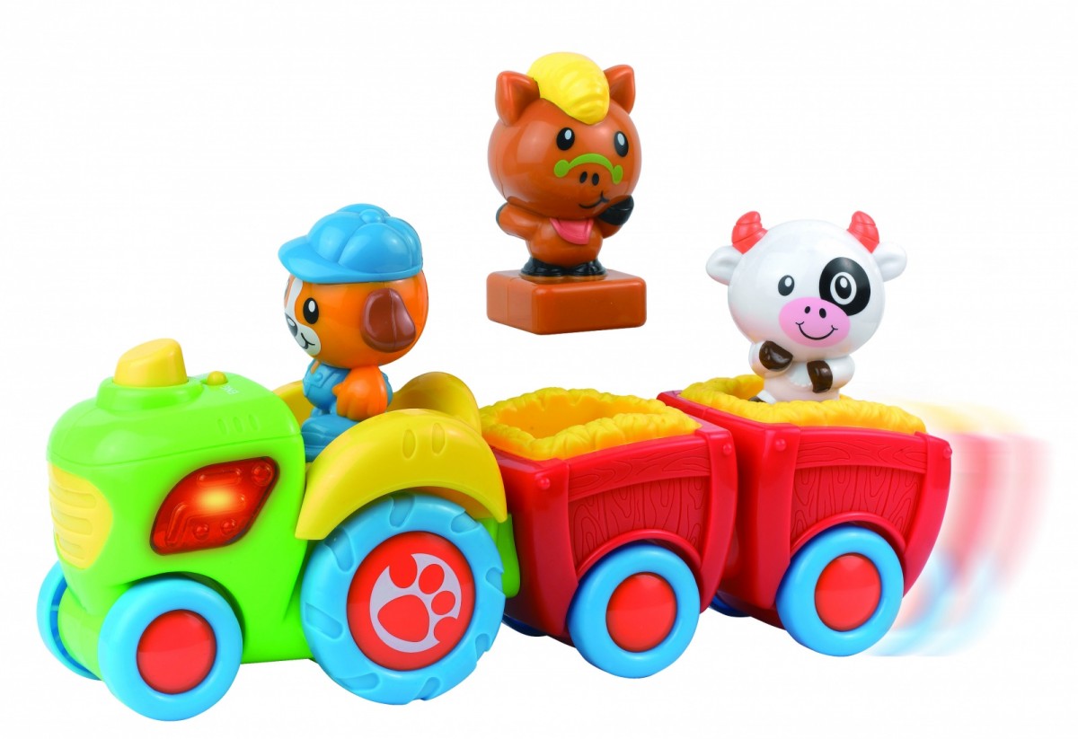 Traktor gra melodyjki i świeci światełkiem. Można wozić nim zwierzątka. Kolorowa zabawka pobudza wyobraźnię, sympatyczne zwierzaki zachęcają do wesołej zabawy.